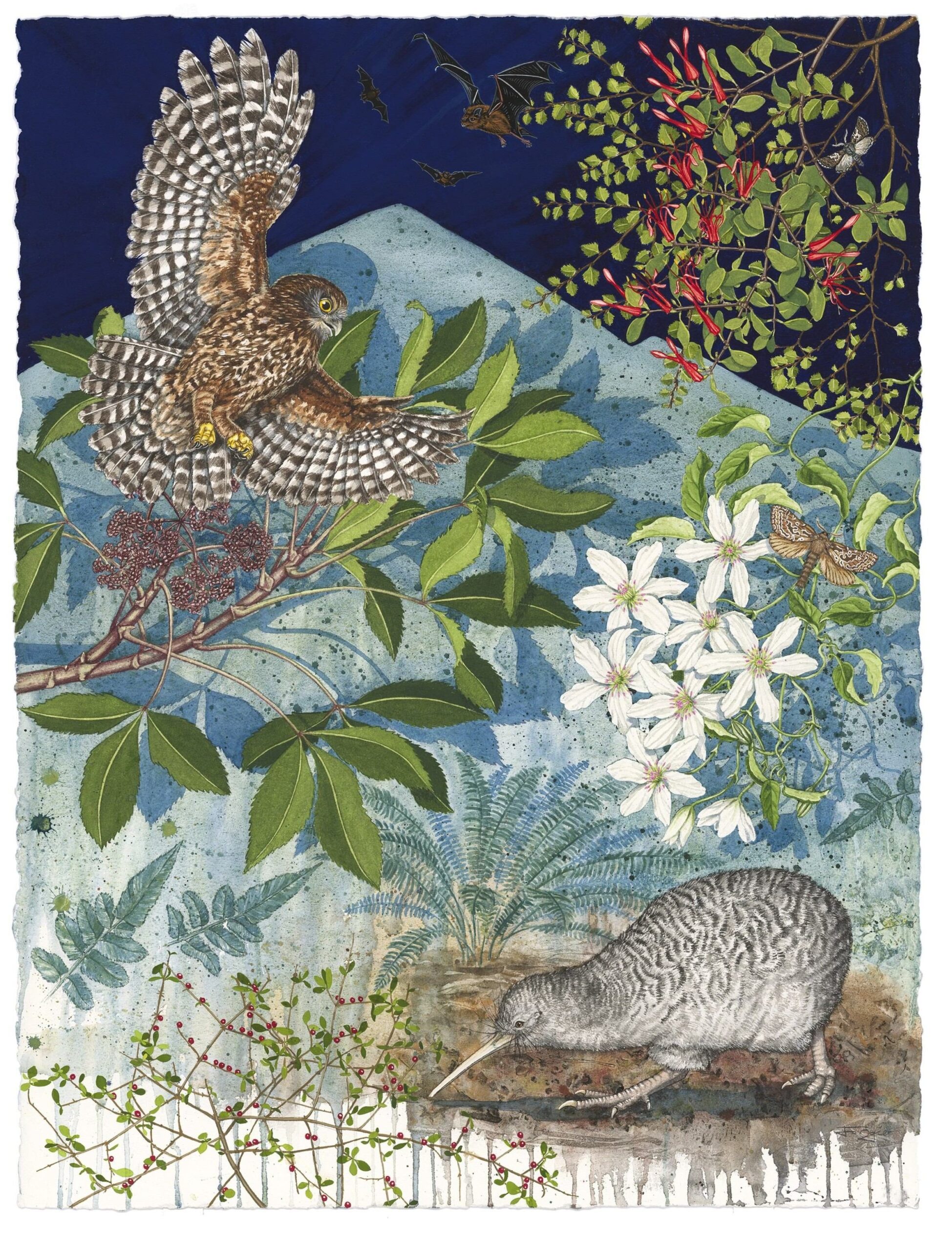 With the support of the Hokonui Rūnanga it also highlights the importance of this section of the Mataura River for its numerous mahinga kai sites and its role as a pathway for those who have gone before. These sites include: Kowhaka-ruru/ Pyramid Hill down to Wharekorokio, Hoka-nui/ East Peak and the Hokonui Hills, Ōnuku/ East Gore Terrace, Kahuika/ Junction of the Waikākahi/ Waikaka and Mataura rivers, Te Au nui Pihapiha Kanakana/ Mataura Falls, Mouth of the Waimumu Stream and Tuturau. Due to the lack of remaining native vegetation and the loss of many species, I have chosen to illustrate what would have been present in pre-European times. I have selected only that which could be reintroduced as to include all the extinct species would be another body of work and perhaps… I like the concept of the possible not the impossible!