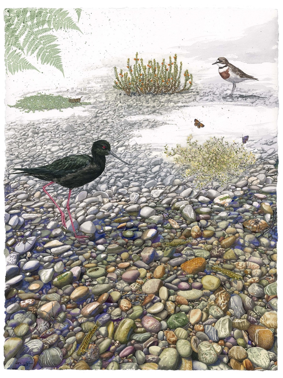 With the support of the Hokonui Rūnanga it also highlights the importance of this section of the Mataura River for its numerous mahinga kai sites and its role as a pathway for those who have gone before. These sites include: Kowhaka-ruru/ Pyramid Hill down to Wharekorokio, Hoka-nui/ East Peak and the Hokonui Hills, Ōnuku/ East Gore Terrace, Kahuika/ Junction of the Waikākahi/ Waikaka and Mataura rivers, Te Au nui Pihapiha Kanakana/ Mataura Falls, Mouth of the Waimumu Stream and Tuturau. Due to the lack of remaining native vegetation and the loss of many species, I have chosen to illustrate what would have been present in pre-European times. I have selected only that which could be reintroduced as to include all the extinct species would be another body of work and perhaps… I like the concept of the possible not the impossible!