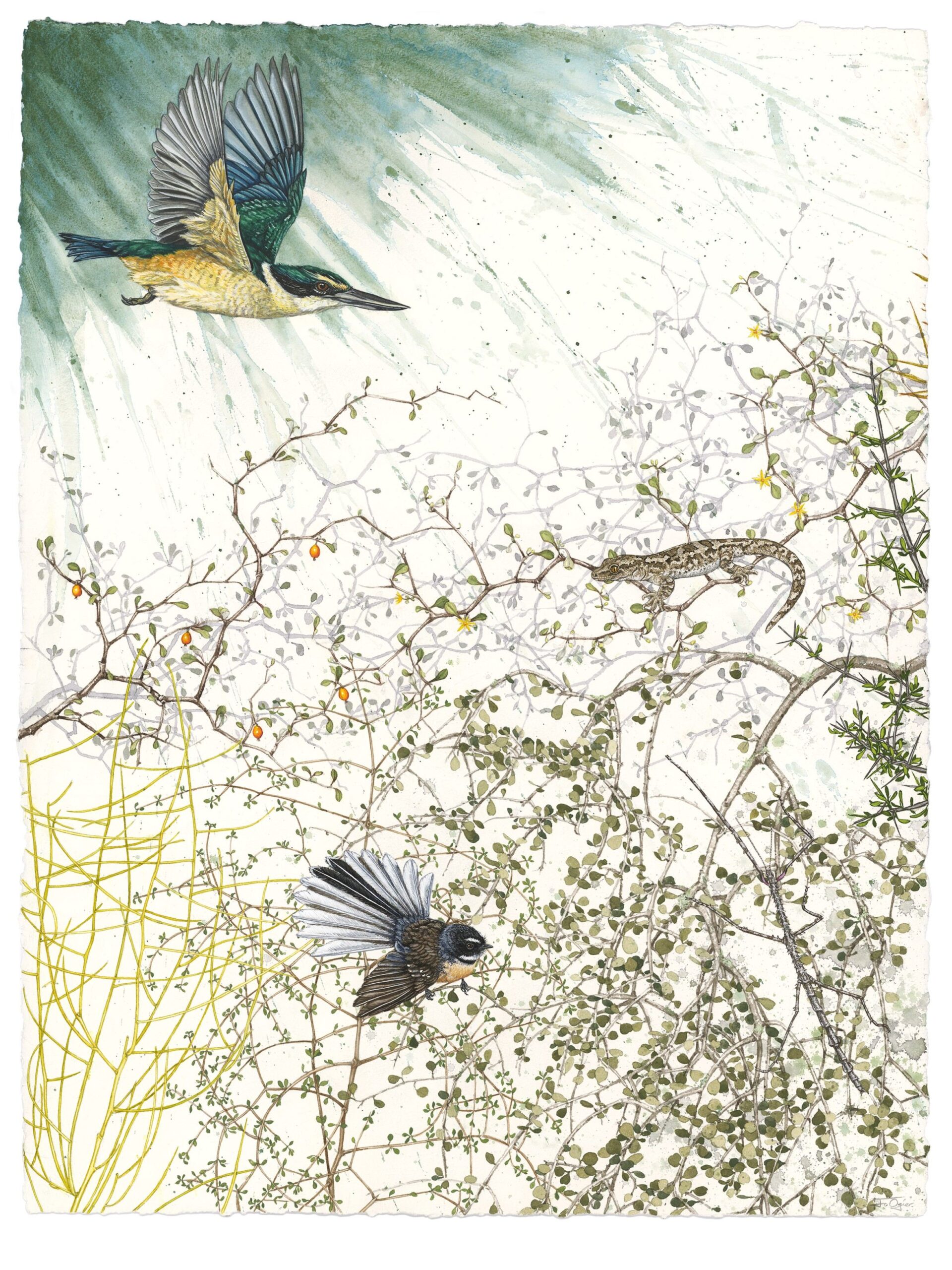 With the support of the Hokonui Rūnanga it also highlights the importance of this section of the Mataura River for its numerous mahinga kai sites and its role as a pathway for those who have gone before. These sites include: Kowhaka-ruru/ Pyramid Hill down to Wharekorokio, Hoka-nui/ East Peak and the Hokonui Hills, Ōnuku/ East Gore Terrace, Kahuika/ Junction of the Waikākahi/ Waikaka and Mataura rivers, Te Au nui Pihapiha Kanakana/ Mataura Falls, Mouth of the Waimumu Stream and Tuturau. Due to the lack of remaining native vegetation and the loss of many species, I have chosen to illustrate what would have been present in pre-European times. I have selected only that which could be reintroduced as to include all the extinct species would be another body of work and perhaps… I like the concept of the possible not the impossible!