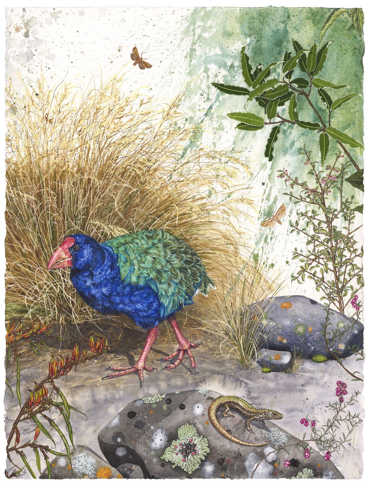 With the support of the Hokonui Rūnanga it also highlights the importance of this section of the Mataura River for its numerous mahinga kai sites and its role as a pathway for those who have gone before. These sites include: Kowhaka-ruru/ Pyramid Hill down to Wharekorokio, Hoka-nui/ East Peak and the Hokonui Hills, Ōnuku/ East Gore Terrace, Kahuika/ Junction of the Waikākahi/ Waikaka and Mataura rivers, Te Au nui Pihapiha Kanakana/ Mataura Falls, Mouth of the Waimumu Stream and Tuturau. Due to the lack of remaining native vegetation and the loss of many species, I have chosen to illustrate what would have been present in pre-European times. I have selected only that which could be reintroduced as to include all the extinct species would be another body of work and perhaps… I like the concept of the possible not the impossible!
