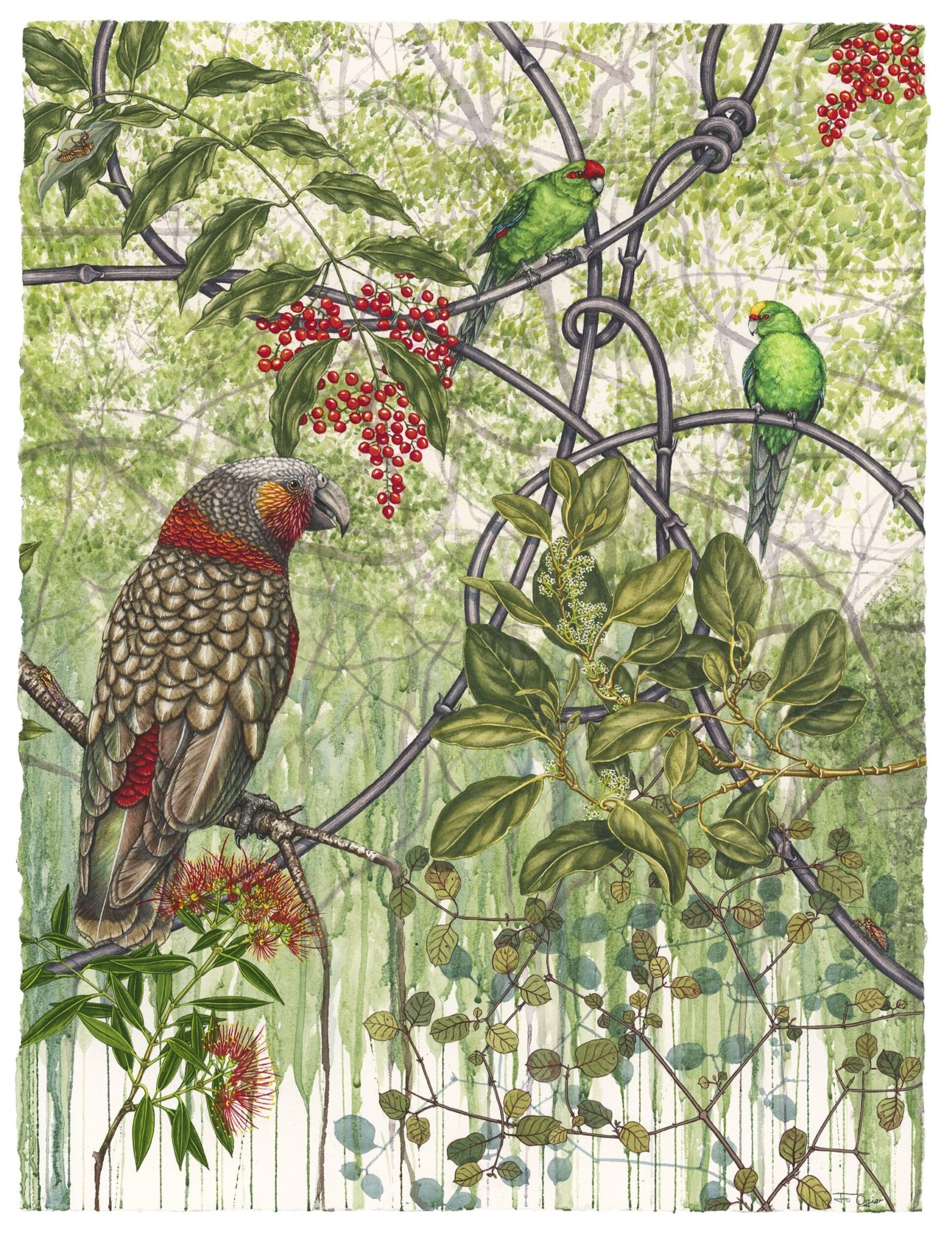 With the support of the Hokonui Rūnanga it also highlights the importance of this section of the Mataura River for its numerous mahinga kai sites and its role as a pathway for those who have gone before. These sites include: Kowhaka-ruru/ Pyramid Hill down to Wharekorokio, Hoka-nui/ East Peak and the Hokonui Hills, Ōnuku/ East Gore Terrace, Kahuika/ Junction of the Waikākahi/ Waikaka and Mataura rivers, Te Au nui Pihapiha Kanakana/ Mataura Falls, Mouth of the Waimumu Stream and Tuturau. Due to the lack of remaining native vegetation and the loss of many species, I have chosen to illustrate what would have been present in pre-European times. I have selected only that which could be reintroduced as to include all the extinct species would be another body of work and perhaps… I like the concept of the possible not the impossible!