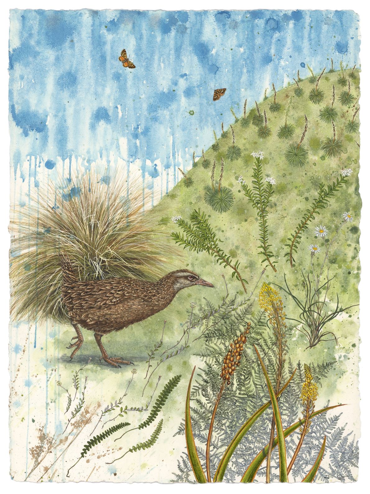 With the support of the Hokonui Rūnanga it also highlights the importance of this section of the Mataura River for its numerous mahinga kai sites and its role as a pathway for those who have gone before. These sites include: Kowhaka-ruru/ Pyramid Hill down to Wharekorokio, Hoka-nui/ East Peak and the Hokonui Hills, Ōnuku/ East Gore Terrace, Kahuika/ Junction of the Waikākahi/ Waikaka and Mataura rivers, Te Au nui Pihapiha Kanakana/ Mataura Falls, Mouth of the Waimumu Stream and Tuturau. Due to the lack of remaining native vegetation and the loss of many species, I have chosen to illustrate what would have been present in pre-European times. I have selected only that which could be reintroduced as to include all the extinct species would be another body of work and perhaps… I like the concept of the possible not the impossible!