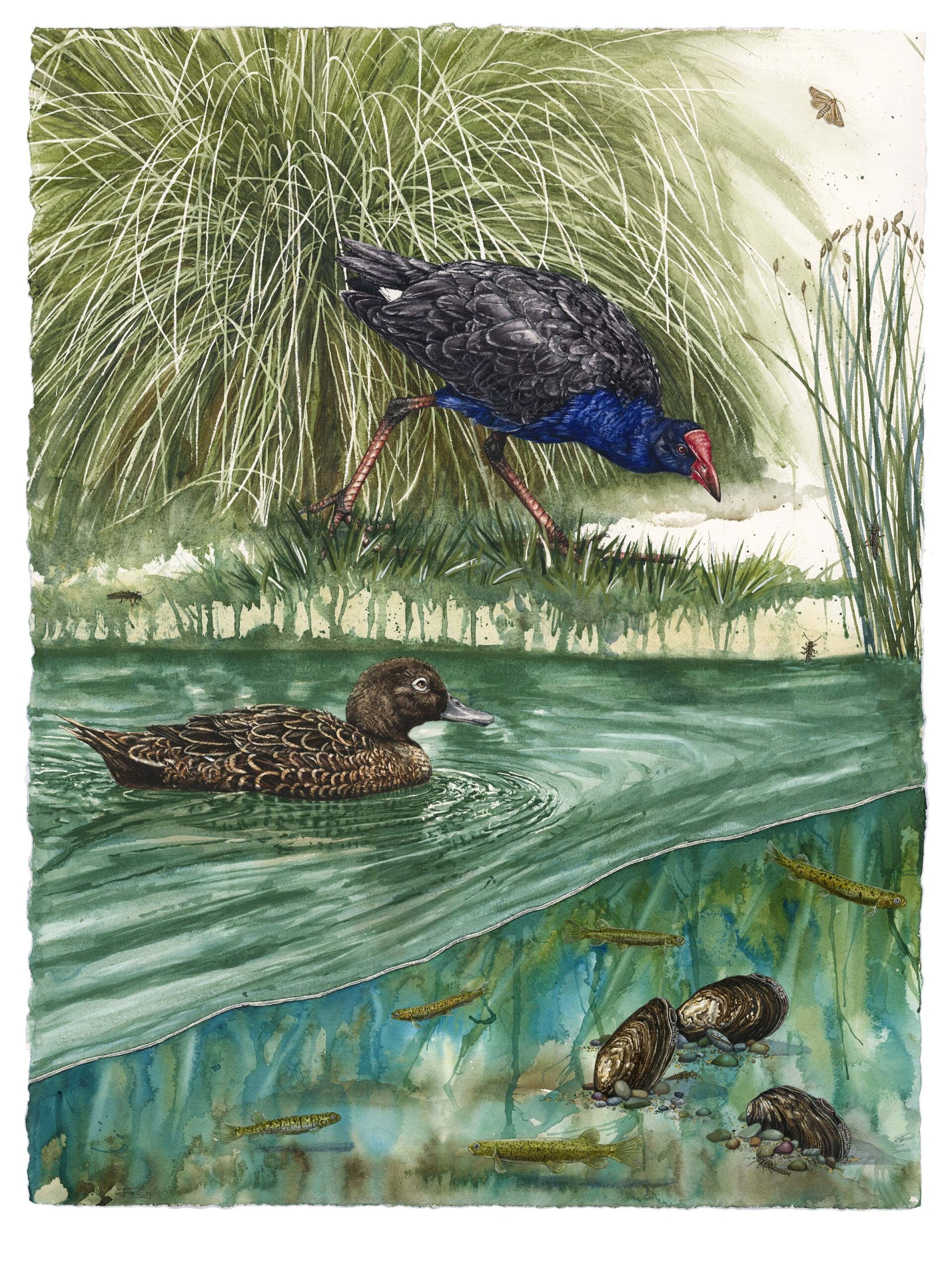 The exhibition has been a collaborative project that collectively links the natural habitats of our indigenous flora and fauna with archive-based information sourced through oral histories gathered from key kaumātua from the Hokonui Rῡnanga, the Eastern Southland Gallery and other experts such as Brian Rance, Eric Edwards, Daniel Jack and others. The featured artworks not only explore the many species of flora and fauna that once defined Māruawai and the wider Mataura River Valley, but also incorporate their early names and associated locations.