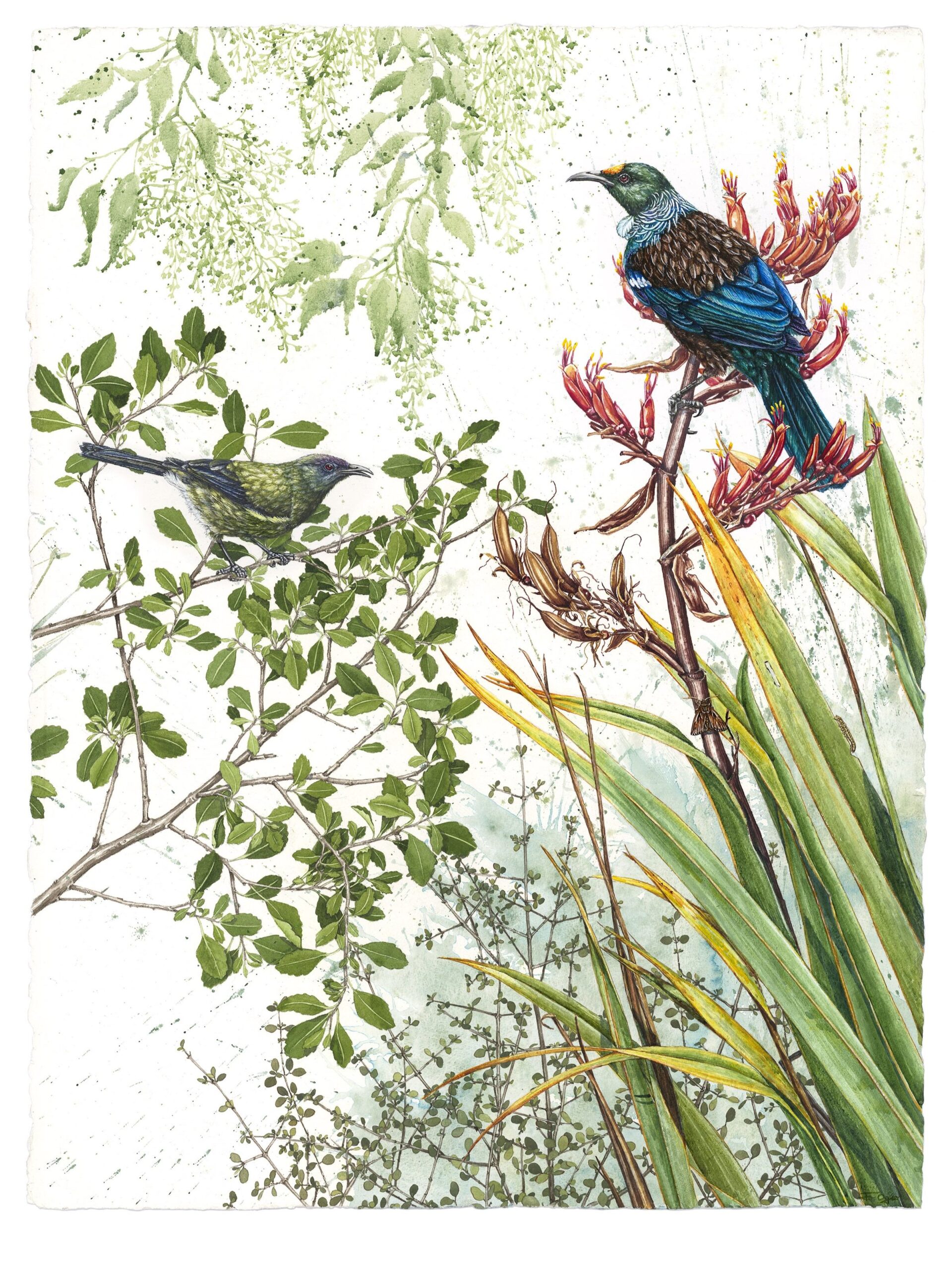 The exhibition has been a collaborative project that collectively links the natural habitats of our indigenous flora and fauna with archive-based information sourced through oral histories gathered from key kaumātua from the Hokonui Rῡnanga, the Eastern Southland Gallery and other experts such as Brian Rance, Eric Edwards, Daniel Jack and others. The featured artworks not only explore the many species of flora and fauna that once defined Māruawai and the wider Mataura River Valley, but also incorporate their early names and associated locations.