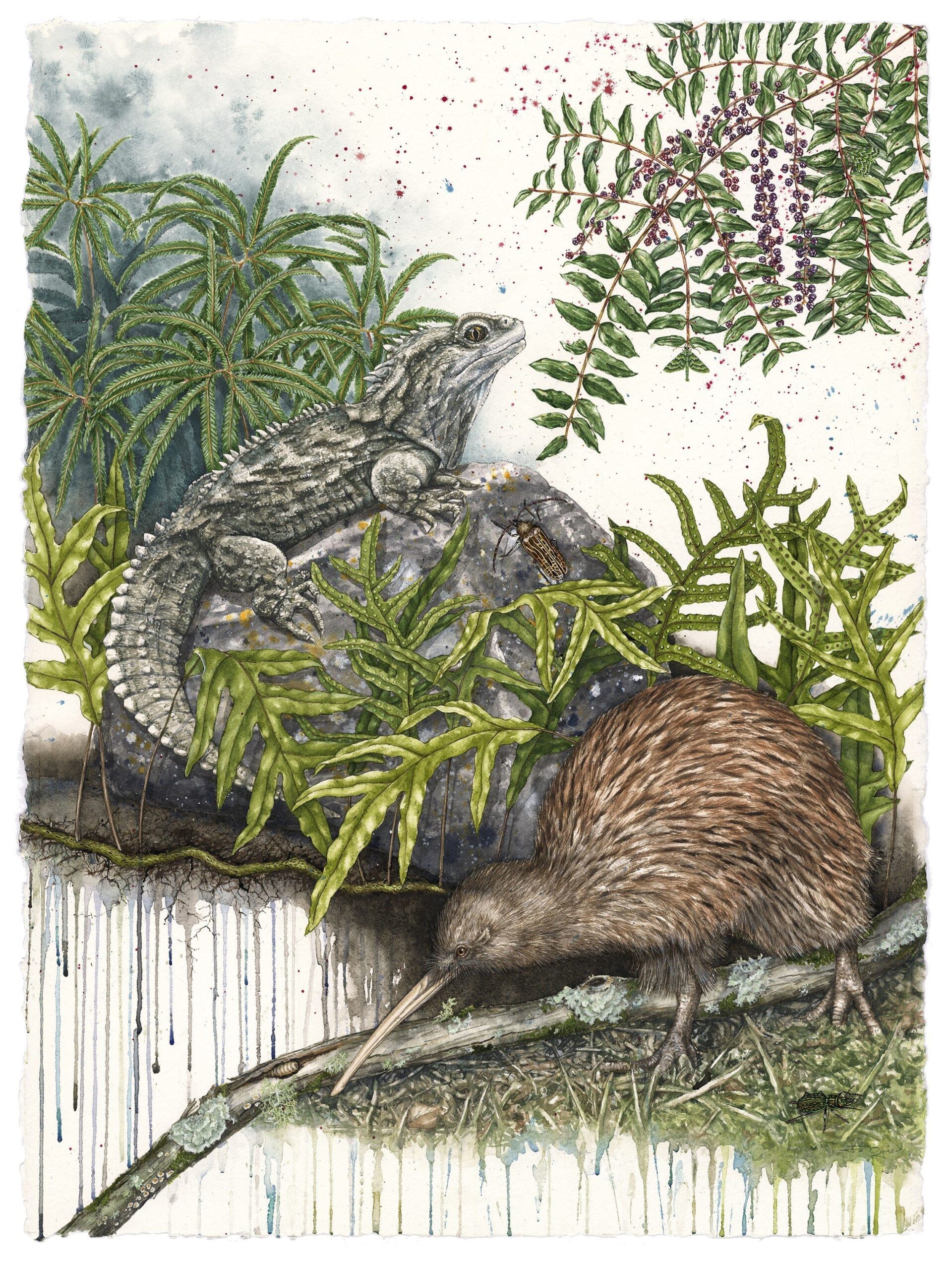 With the support of the Hokonui Rūnanga it also highlights the importance of this section of the Mataura River for its numerous mahinga kai sites and its role as a pathway for those who have gone before. These sites include: Kowhaka-ruru/ Pyramid Hill down to Wharekorokio, Hoka-nui/ East Peak and the Hokonui Hills, Ōnuku/ East Gore Terrace, Kahuika/ Junction of the Waikākahi/ Waikaka and Mataura rivers, Te Au nui Pihapiha Kanakana/ Mataura Falls, Mouth of the Waimumu Stream and Tuturau. Due to the lack of remaining native vegetation and the loss of many species, I have chosen to illustrate what would have been present in pre-European times. I have selected only that which could be reintroduced as to include all the extinct species would be another body of work and perhaps… I like the concept of the possible not the impossible!