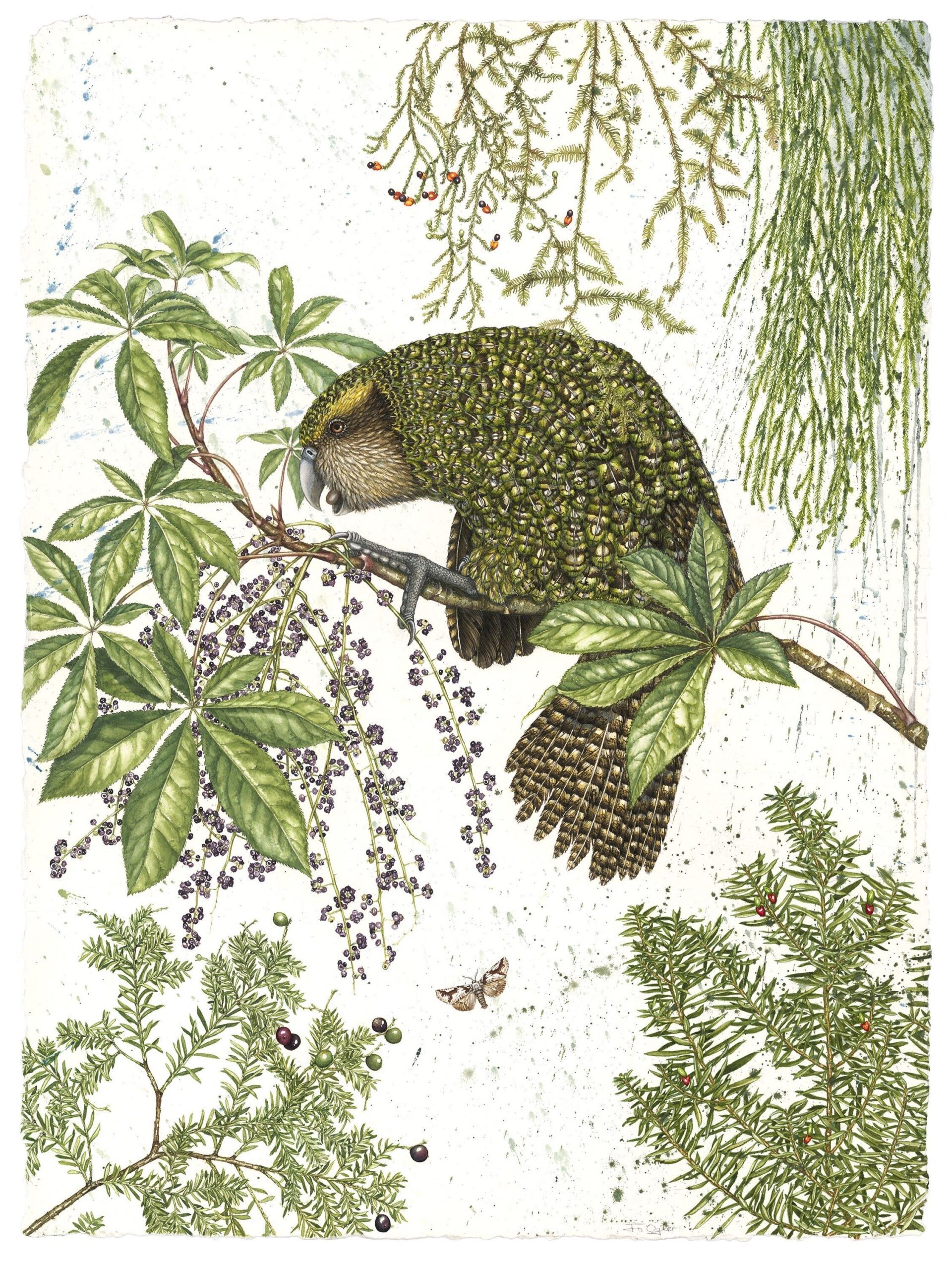 With the support of the Hokonui Rūnanga it also highlights the importance of this section of the Mataura River for its numerous mahinga kai sites and its role as a pathway for those who have gone before. These sites include: Kowhaka-ruru/ Pyramid Hill down to Wharekorokio, Hoka-nui/ East Peak and the Hokonui Hills, Ōnuku/ East Gore Terrace, Kahuika/ Junction of the Waikākahi/ Waikaka and Mataura rivers, Te Au nui Pihapiha Kanakana/ Mataura Falls, Mouth of the Waimumu Stream and Tuturau. Due to the lack of remaining native vegetation and the loss of many species, I have chosen to illustrate what would have been present in pre-European times. I have selected only that which could be reintroduced as to include all the extinct species would be another body of work and perhaps… I like the concept of the possible not the impossible!