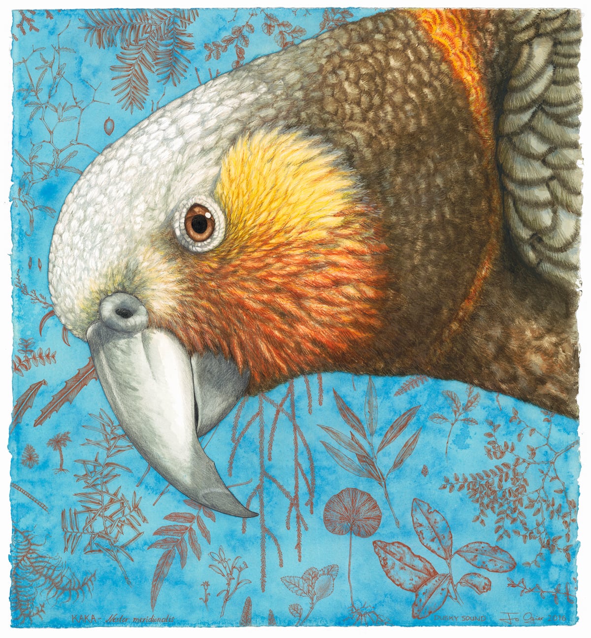 Competition from wasps and bees for the honeydew excreted by scale insects on beech trees is also an issue. The botanical images in the background of the work are of the specimens drawn and collected when I was in Dusky Sound.